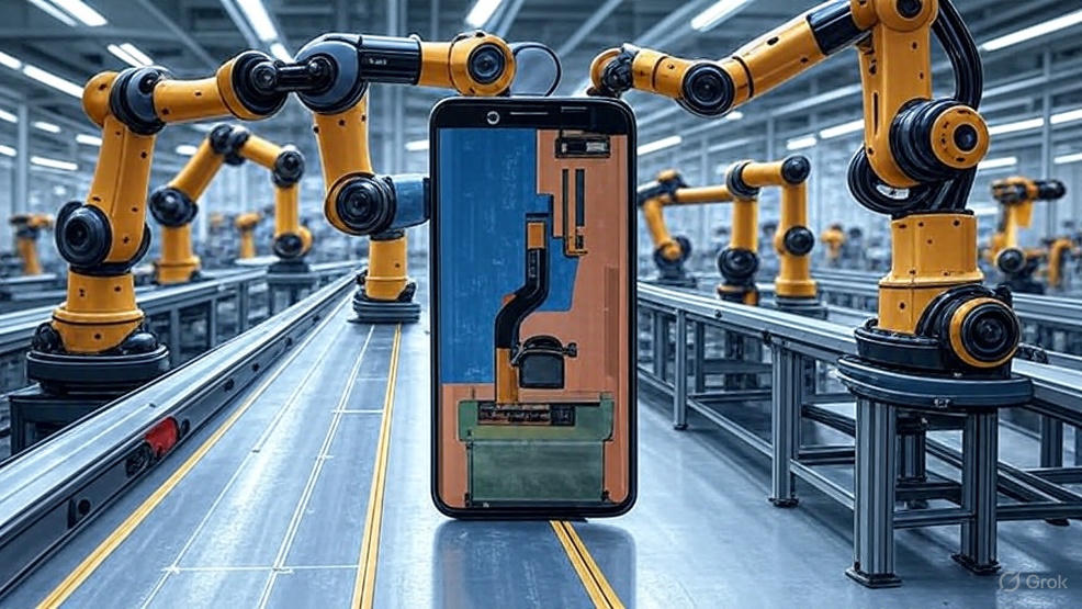 高精度智能制造产线,机械臂正在进行微米级精密零组件的自动化组装与检测,代表消费电子核心部件的极致工艺与品质保障。